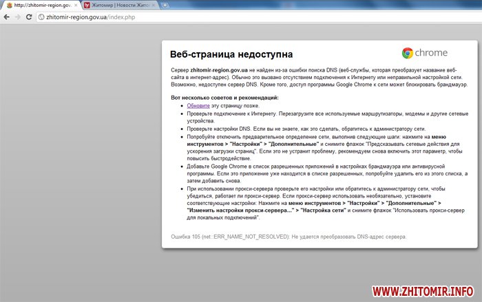Сайт Житомирской областной администрации перестал работать около 22 часов вечера. Свою работу сайт возобновил около 10 утра.