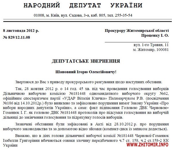 Также народный депутат сообщает прокурору области о том, что 29 октября 2012 председатель участковой избирательной комиссии № 181384 после подсчета голосов избирателей на указанном участке повез несколько экземпляров протоколов об итогах голосования не в ОИК избирательного округа № 62, а в помещение Житомирской городской организации «Партии регионов». В действиях председателя участковой комиссии усматриваются признаки преступления, предусмотренного ч.1 ст.157 та ч.2. ст.158 УК Украины.