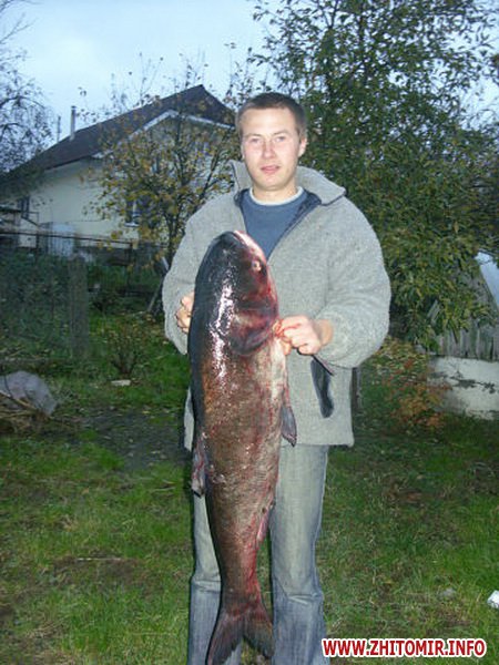 На днях 24-летний житель Малина Вадим Кумаринець поймал в одном из прудов соседнего города Радомышль 16-килограммового толстолобика. Длина пойманной рыбы около метра.