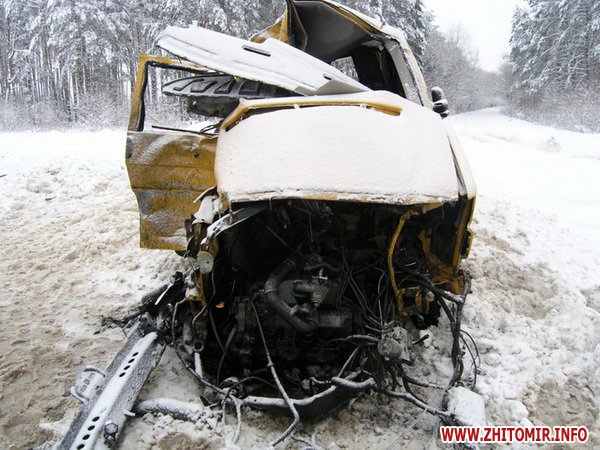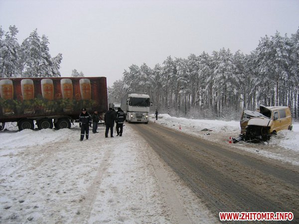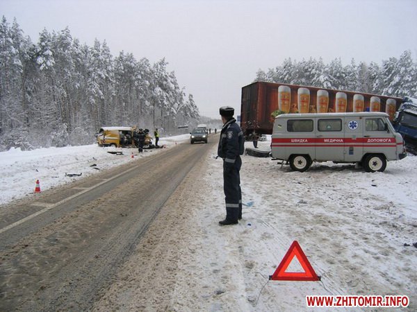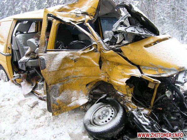 «Утром 11 декабря в Житомирском районе произошло дорожно-транспортное происшествие с пострадавшими. Такое сообщение поступило по телефону «102». На место происшествия немедленно выехали сотрудники ГАИ и следственно-оперативная группа. По предварительной информации, водитель микроавтобуса «Фольксвагена», который двигался в направлении Киева, не учел сложных погодных условий, не выбрал безопасную скорость движения, в результате чего не справился с управлением и выехал на полосу встречного движения, где совершил столкновение с фурой , который двигался навстречу», - говорится в сообщении пресс-службы.