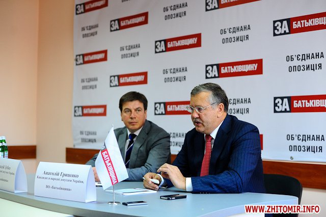 Кандидаты в народные депутаты Геннадий Зубко и Анатолий Гриценко на пресс-конференции в Житомире 27 сентября 2012 года
