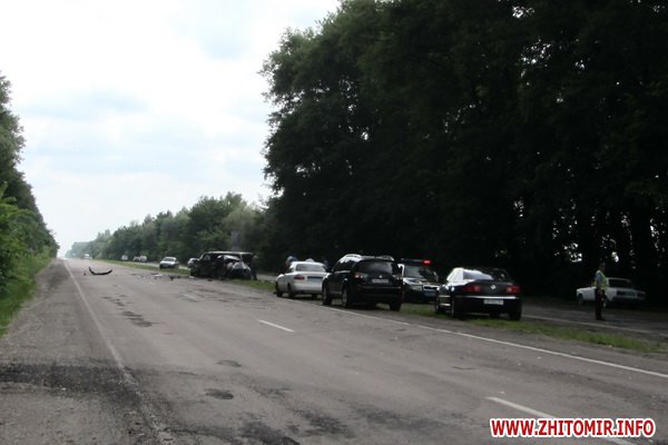 На трассе Житомир-Могилев-Подольский (М-21), возле поворота в сторону села Кодня Житомирского района, автомобиль Subaru с киевскими номерами, двигавшийся в направлении Бердичева, выехал на полосу встречного движения и совершил столкновением с микроавтобусом Mercedes с житомирскими номерами, который двигался во встречном направлении.