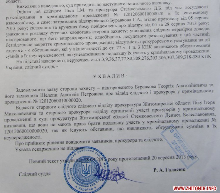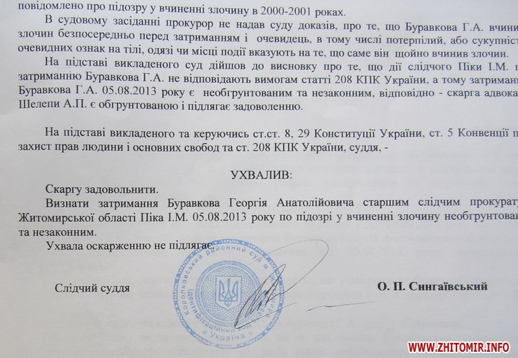 «30 сентября Королевский районный суд Житомира удовлетворил жалобу стороны защиты и постановил признать задержание Буравкова Георгия Анатольевича старшим следователем прокуратуры Житомирской области 5 августа 2013 года по подозрению в совершении преступления необоснованным и незаконным», - рассказал Анатолий Шелепа.