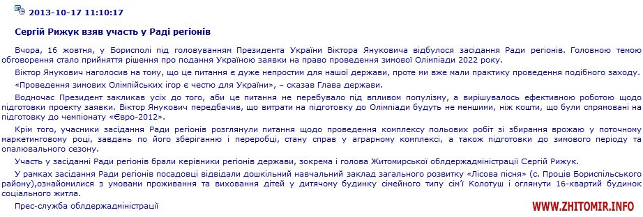 В тоже время, в сообщениина сайте Житомирской облгосадминистрации говорится, что главной темой обсуждения был вопрос проведения в Украине зимней Олимпиады-2022. Вскользь упоминается о сборе урожая и подготовке к отопительному сезону.