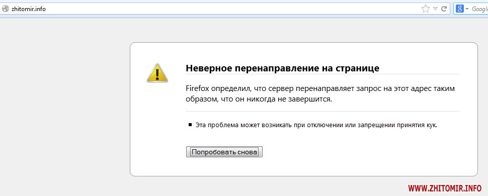 При попытке открыть Житомир.info появлялось сообщение «Соединение было сброшено» или «Неверное перенаправление на странице».