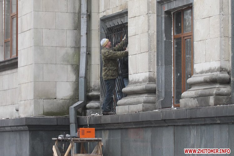 В Доме правосудия на центральной площади Житомира меняют окна и ставят металлические решетки на первом этаже.