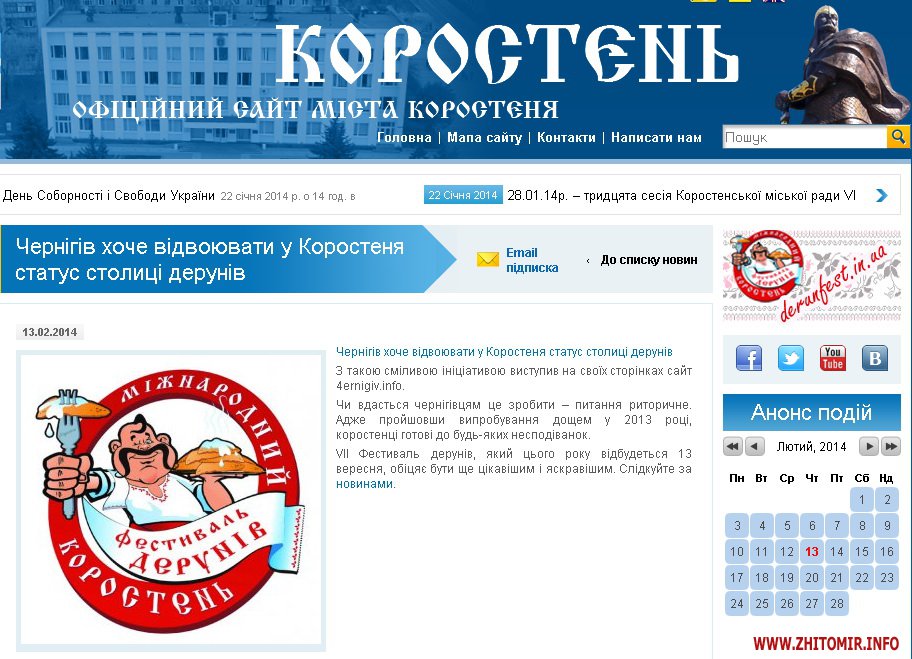 «Чернигов хочет отвоевать у Коростеня статус столицы дерунов», - новость с таким названием 13 февраля появилась на официальном сайте города Коростень.