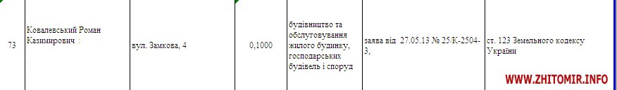 На сайте Житомирского горсовета опубликовано решение сессии №556 от 30 мая 2013 года "О предоставлении разрешения гражданам на изготовление документации по землеустройства и предоставления разрешения на составление проектов по землеустройству относительно отвода земельных участков". В приложении к данному решению сессии указано, что разрешение на строительство жилого дома предоставлялось на участок по адресу ул. Замковая, 4. Решение было принято через три дня после подачи соответствующего заявления.