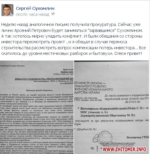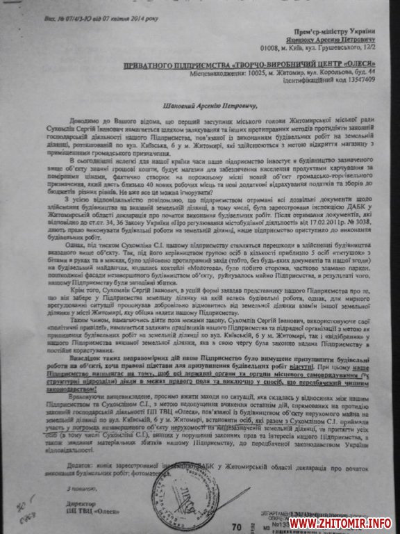 «Доводим до Вашего сведения, что первый заместитель городского главы Житомирского городского совета Сухомлин Сергей Иванович пытается путем запугивания и других противоправных методов противодействовать законной хозяйственной деятельности нашего Предприятия, связанной с выполнением строительных работ на земельном участке, расположенном по ул.Киевская, 6 в г.Житомире, которые осуществляются с целью открытия магазина с помещениями общественного назначения», - говорится в письме.