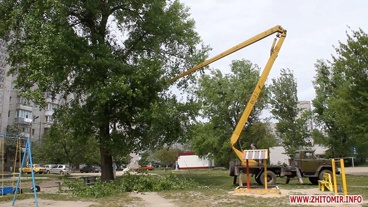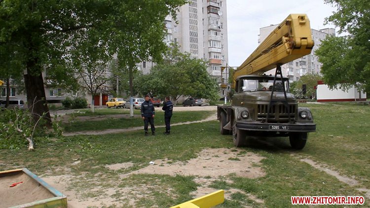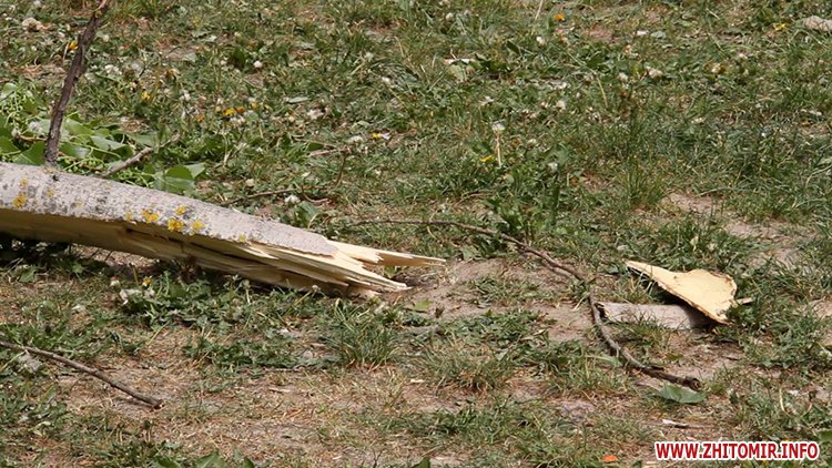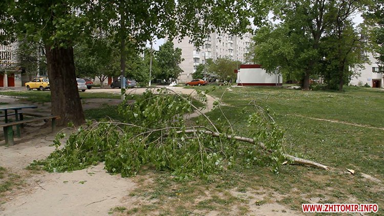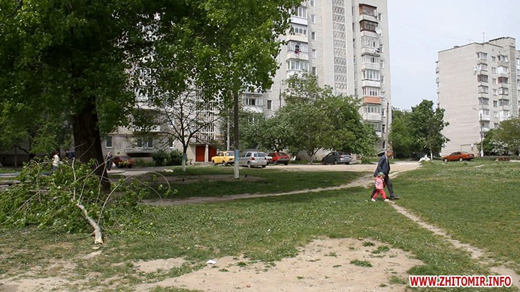 12 травня у Житомирі в одному з дворів по вулиці Жукова гілка зі старої тополі впала на дитячий майданчик і мало не прибила людину. Очевидці розповідають: зірвався сильний вітер, тополя хруснула і велетенська гілка полетіла додолу, чоловік ледь устиг відскочити. Люди кажуть: тут щодня грається купа дітей і, якби вона впала в той момент, наслідки були б жахливими.