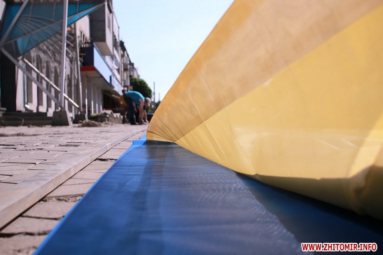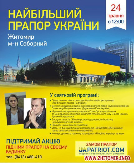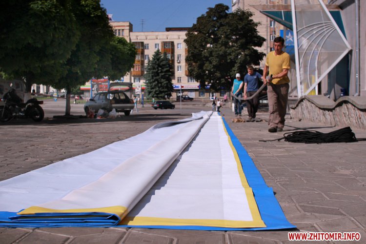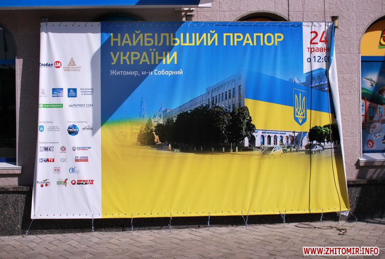 Нагадаємо, гігантський прапор України вивісять на фасаді будинку у центрі Житомира 24 травня о 12.00. В програмі заходу, окрім фіксації рекорду України «Найбільший прапор на будівлі», хорова капела «Орея» виконає Гімн України, також планується музичний подарунок від Артема Кондратюка та Житомирського інституту культури і мистецтв. Поряд проводитиметься ярмарок національних сувенірів та конкурс дитячого малюнку на асфальті.