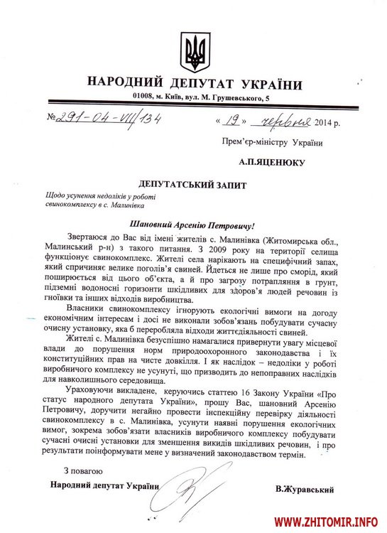 Народний депутат Віталій Журавський, обраний по мажоритарному округу №66 у Житомирській області, направив прем’єр-міністру України запит щодо усунення недоліків у роботі свинокомплексу с.Малинівка Малинського району.