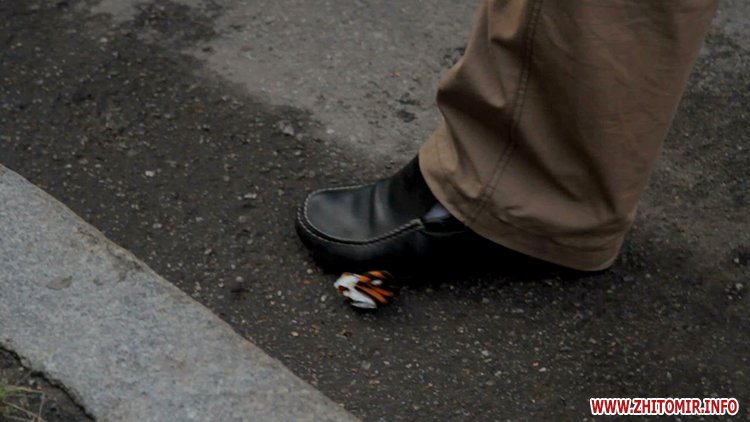 Активист считает, что в то время, когда житомиряне провожают ребят на войну, офицер не имеет право появляться с георгиевской ленточкой в центре города.