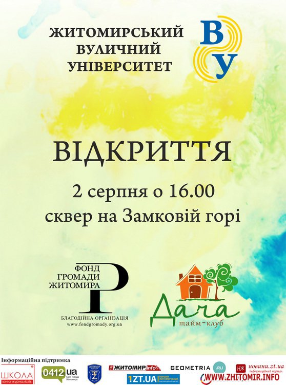2 серпня о 16.00 год. «Фонд громади Житомира» спільно з тайм-клубом «Дача» в сквері на Замкові горі презентує проект неформальної освіти «Вуличний університет».