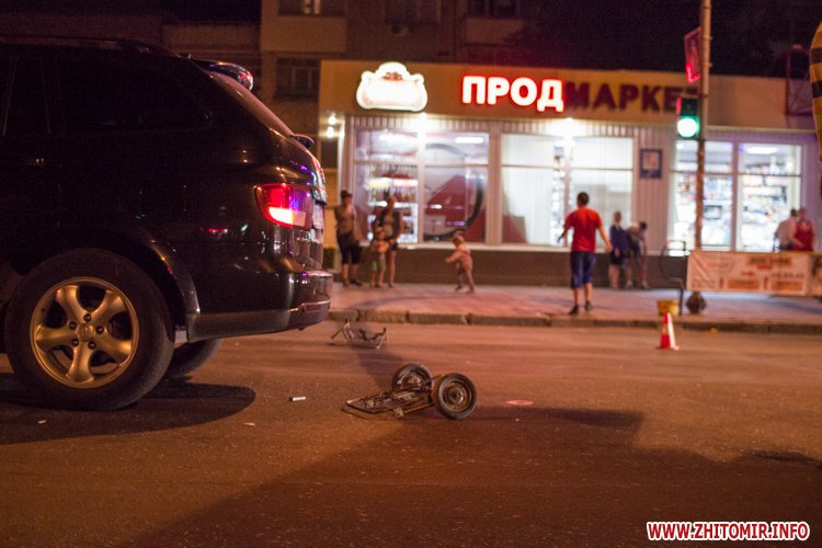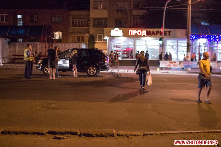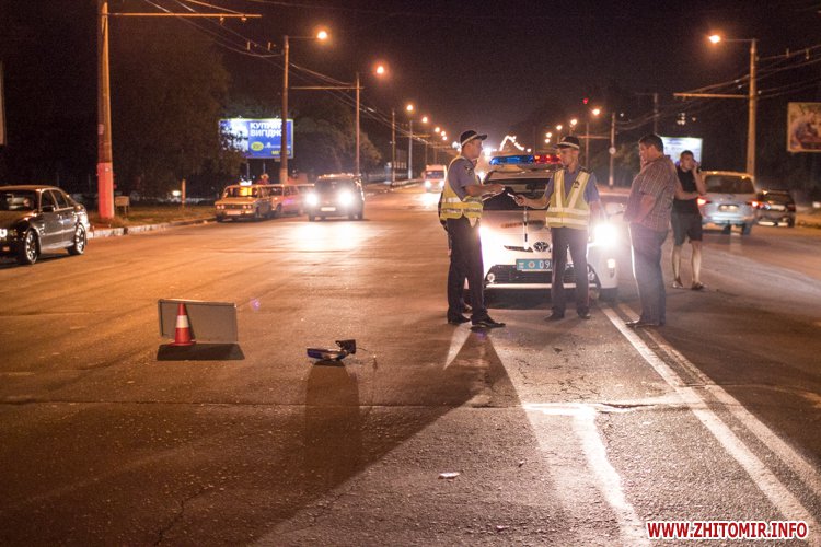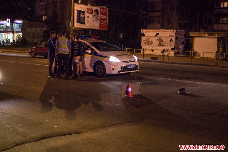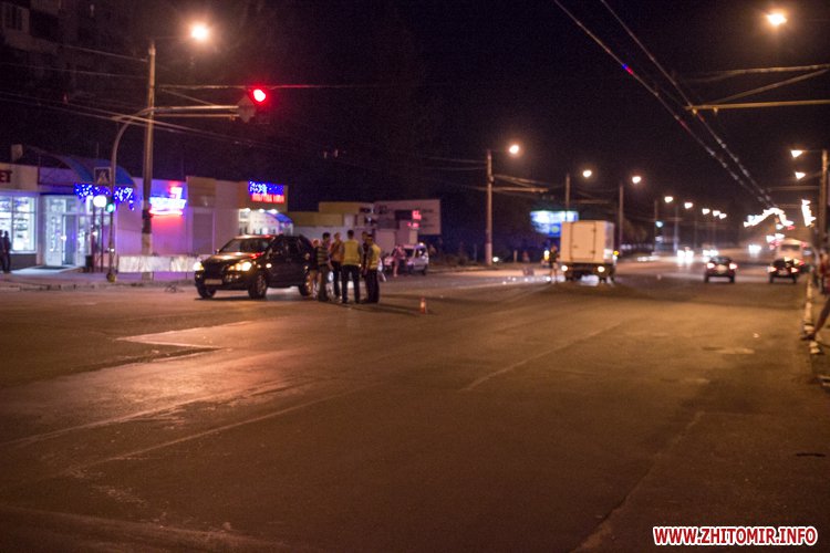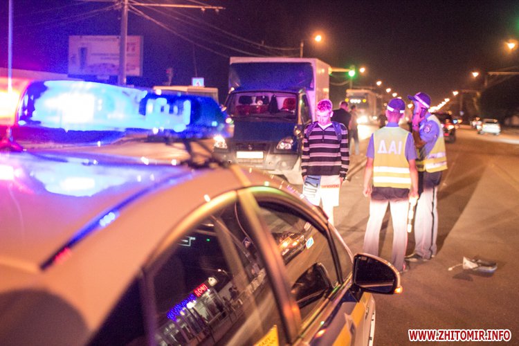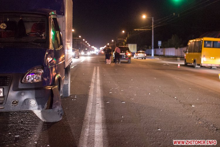 «Около 21.00 19 августа на перекрестке просп. Мира - ул. Жукова водитель автомобиля ГАЗ-3302, житель Житомира, 1983 года рождения, двигаясь по проспекту Мира в направлении ул. Ватутина, совершил наезд на мужчину, который пересекал проезжую часть справа налево по ходу движения автомобиля. В результате наезда пешехода отбросило на встречную полосу движения, где на него было совершено наезд автомобилем SsangYong, под управлением жительницы Житомира, 1974 года рождения, который двигался во встречном направлении», - информируют в Госавтоинспекции.