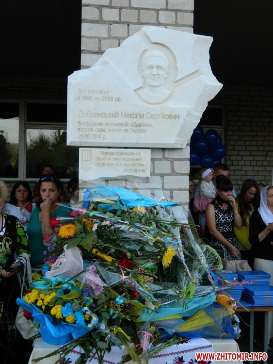 Хвилюючим моментом Дня знань в гуманітарній гімназії №5 стало відкриття меморіальної дошки на честь випускника цього навчального закладу Добрянського Максима Сергійовича, який героїчно загинув в жорстокій сутичці з бойовиками в зоні АТО 26 червня 2014 року, а 14 серпня старший солдат 95-ї аєромобільної бригади посмертно був нагороджений орденом «За мужність» ІІІ ступеня. На рідкритті була присутня родина героя.