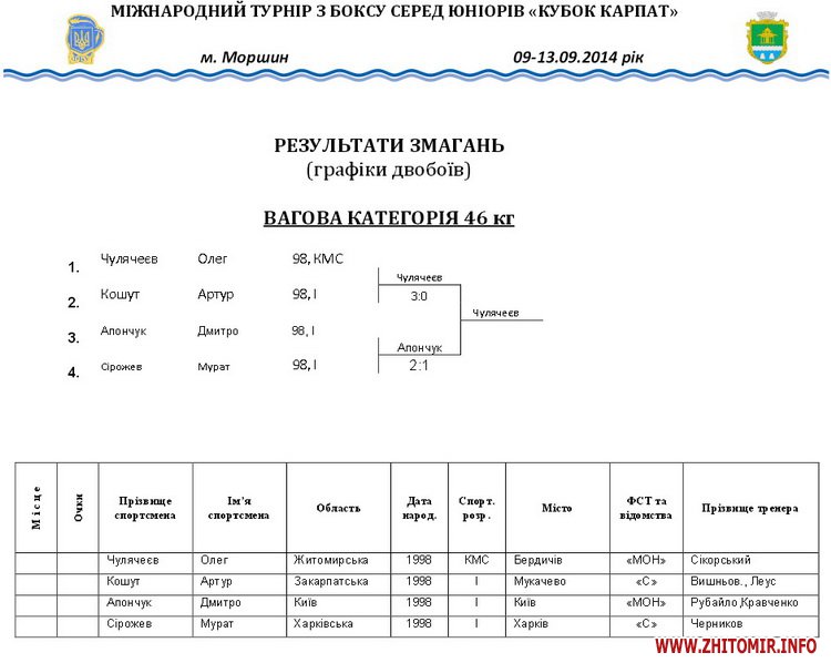 Бердичівлянин Олег Чулячеєв (тренер Олег Сікорський) виграв міжнародний турнір з боксу серед юніорів «Кубок Карпат», який 9-13 вересня проходив у Моршині Львівської області.
