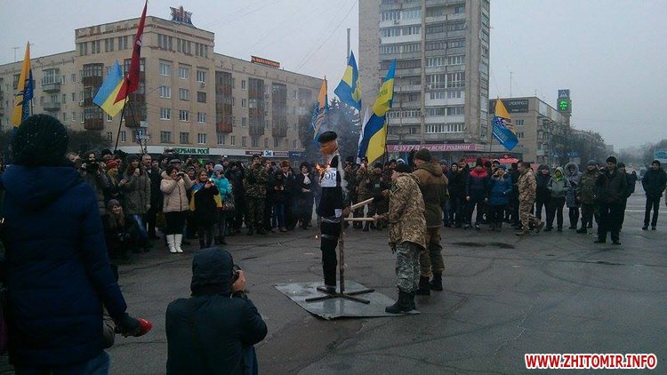 Во время акции сожгли чучело Путина, на груди которого висела табличка «Агрессор».