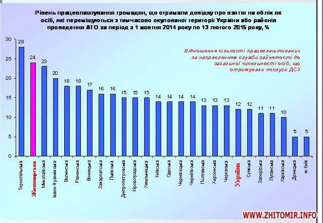Центри зайнятості області посприяли у працевлаштуванні 245 громадян, що вимушено покинули місця свого постійного проживання, з них – 179 громадян, які набули статусу внутрішньо переміщених осіб у період з 1 жовтня 2014 року по 13 лютого 2015 року. За рівнем їх працевлаштування (відношення кількості працевлаштованих до загальної чисельності тих, які отримували послуги) Житомирщина на другому місці у державі з показником 24% при середньому рівні 12%.
