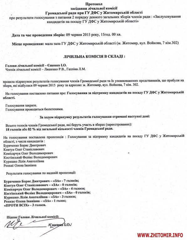 Копія протоколу засідання лічильної комісії громадської ради щодо підтримки кандидатів, що відбулося 9 червня 2015 року, є у розпорядженні Житомир.info.