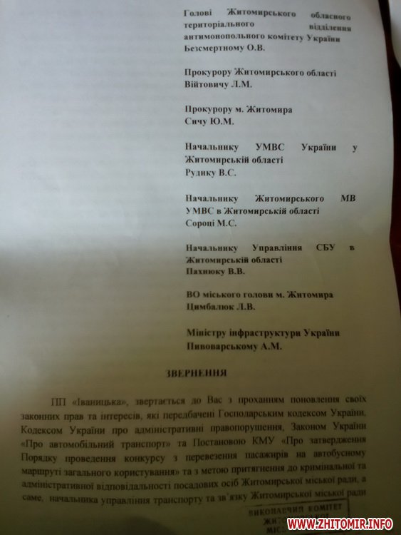 Перед початком конкурсного комітету чиновники одноосібно внесли зміни до комісії та не призначили секретаря конкурсного комітету. Вони внесли до комісії перевізників, які є претендентами на перевезення пасажирів у Житомирі, отже, по суті, є зацікавленими особами. А це є грубим порушенням ст. 22, ст. 23 Постанови № 1081 «Про затвердження Порядку проведення конкурсу з перевезення пасажирів на автобусному маршруті загального користування».