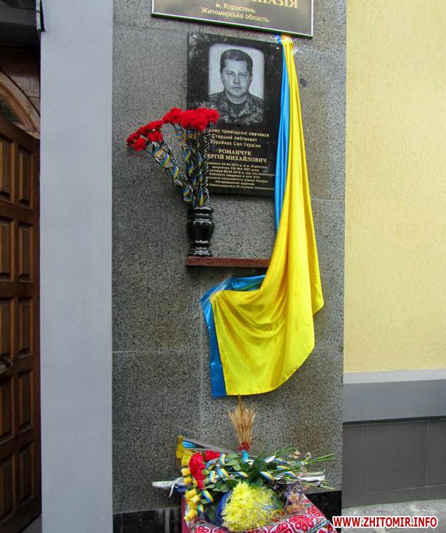 «Меморіальна дошка виготовлена за кошти, які були зібрані членами Громадської організації «Братство ветеранів АТО Коростенщини». Романчук Сергій Михайлович - старший лейтенант Збройних Сил України, боєць 30-ої бригади, загинув ще 9 лютого 2015 року під с.Логіново Донецької області. Довгий час він вважався безвісті зниклим. Всього двох тижнів не вистачило йому, аби повернутися додому живим», – йдеться у повідомленні.