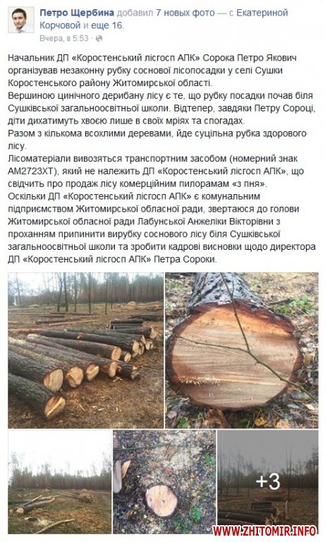 «Вершиною цинічного дерибану лісу є те, що рубку посадки почав біля Сушківської загальноосвітньої школи. Відтепер, завдяки Петру Сороці, діти дихатимуть хвоєю лише в своїх мріях та спогадах. Разом з кількома всохлими деревами, йде суцільна рубка здорового лісу. Лісоматеріали вивозяться транспортним засобом (номерний знак АМ2723ХТ), який не належить ДП «Коростенський лісгосп АПК», що свідчить про продаж лісу комерційним пилорамам «з пня». Оскільки ДП «Коростенський лісгосп АПК» є комунальним підприємством Житомирської обласної ради, звертаюся до голови Житомирської обласної ради Лабунської Анжеліки Вікторівни з проханням припинити вирубку соснового лісу біля Сушківської загальноосвітньої школи та зробити кадрові висновки щодо директора ДП «Коростенський лісгосп АПК» Петра Сороки», – пише Петро Щербина.