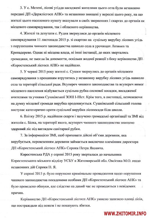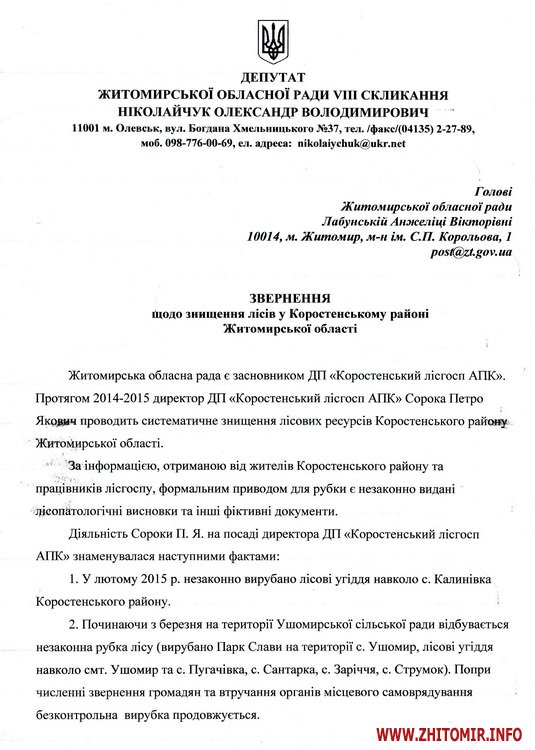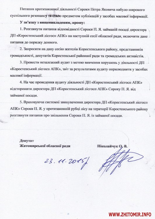 Депутат Житомирської облради Олександр Ніколайчук вже надіслав звернення на ім’я голови обласної ради Анжеліки Лабунської щодо знищення лісів у Коростенському районі. Новообраний депутат просить розглянути відповідність Петра Сороки на займаній посаді директора ДП «Коростенський лісгосп АПК» на наступній сесії обласної ради, включивши до порядку денного. Крім того, провести незалежний аудит з метою вивчення порушень у діяльності ДП «Коростенський лісгосп АПК» та на час проведення аудиту відсторонити Сороку від займаної посади.
