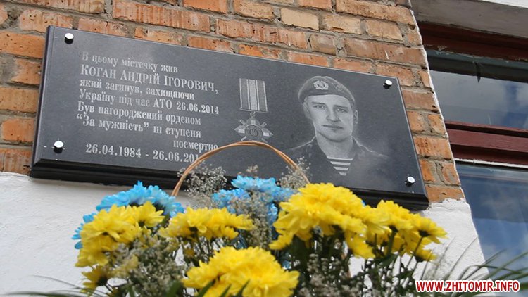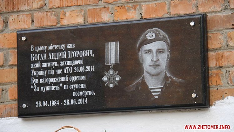 Андрій Коган родом із Запоріжжя, довгий час жив на Вінничині. Як його тато і дід, мріяв стати військовим. Розпочавши службу у 95-й бригаді, він переїхав на Житомирщину, був командиром протитанкового ракетного батальйону, і одразу після окупації Криму одним з перших у складі бригади вирушив на Схід, пройшовши найгарячіші точки у перші місяці війни. 26 червня 2014 року боєць загинув на блокпосту під Слов’янськом. Вшанувати його пам’ять прийшли рідні, сусіди та бойові побратими.