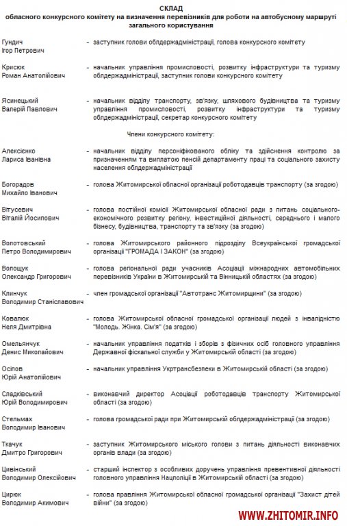 Як повідомляв Житомир.info, у відповіді на депутатський запит кілька місяців тому перший заступник губернатора Геннадій Дмитренко повідомляв, що включення представників громадської ради при Житомирській ОДА до складу конкурсного комітету з визначення перевізників є недоцільним.