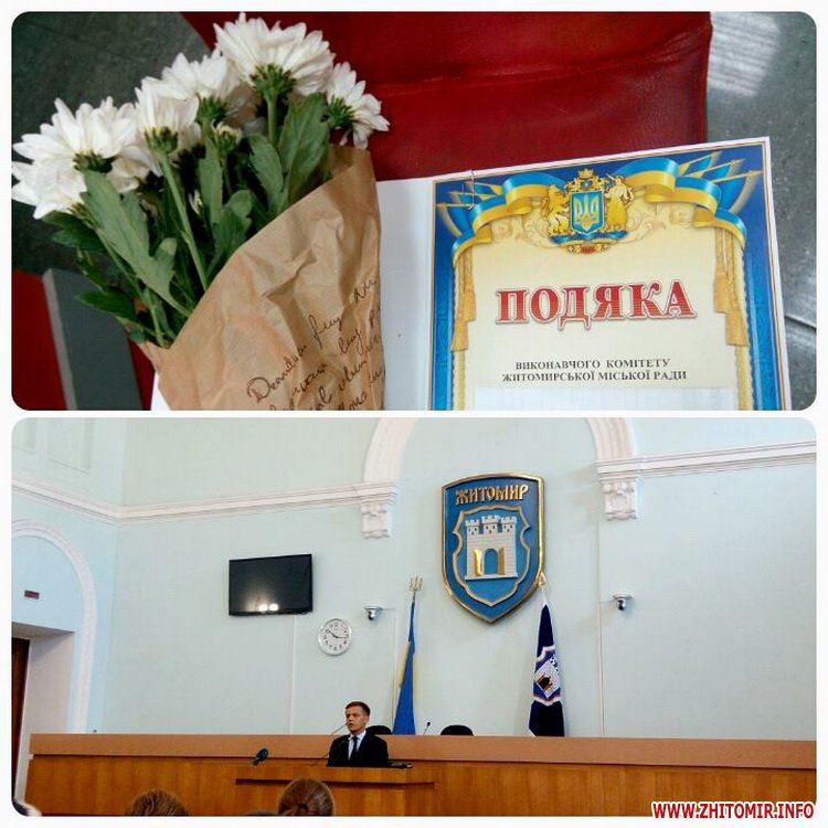 «Згідно розпорядження міського голови від 05.09.2016 № 750 нагородити подякою виконавчого комітету за вагомий внесок у підтримку воїнів АТО та з нагоди Дня міста Житомира: