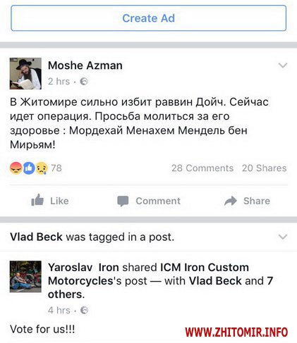 «В Житомире сильно избит раввин Дойч. Сейчас идет операция. Просьба молиться за его здоровье», - написав Моше Асман.