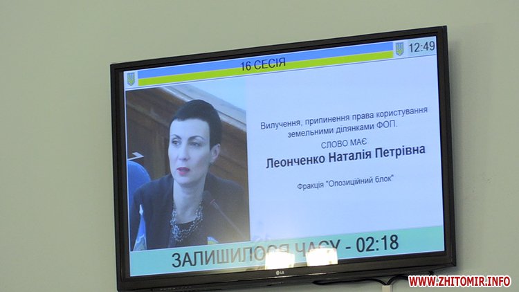 «Питання трапилось наступне: один проект рішення про об’єднання земельних ділянок ми відмовили, прийняли відповідне рішення сесії. А рішення про відмову від земельних ділянок було зняте з порядку денного сесії. Тому, я пропоную зняти це питання на до вивчення», - каже депутат Житомирської міської ради Наталія Леонченко.