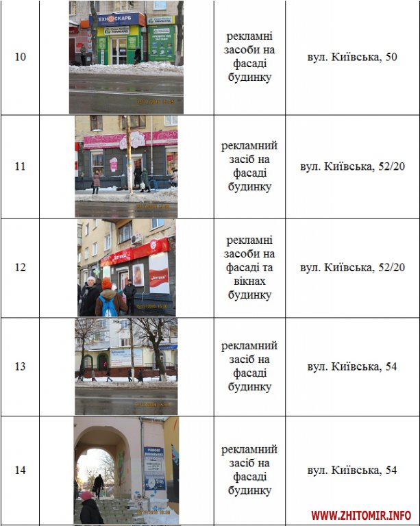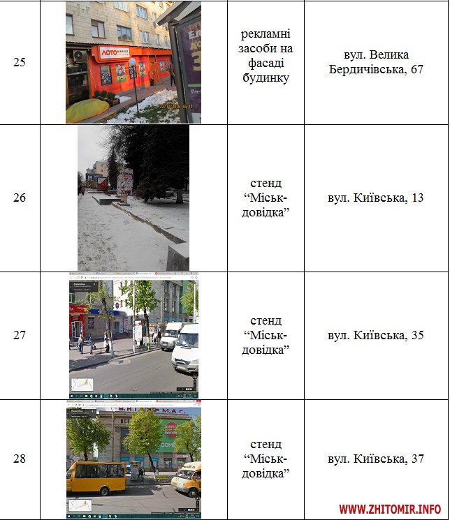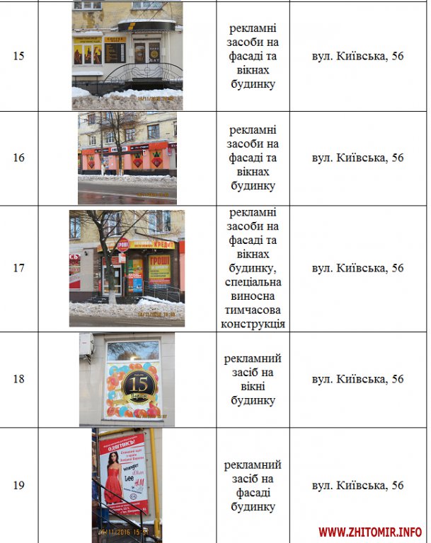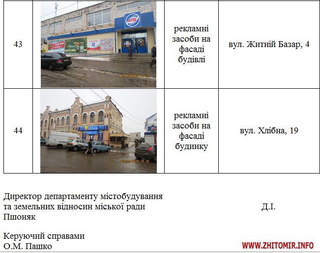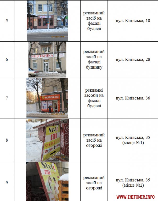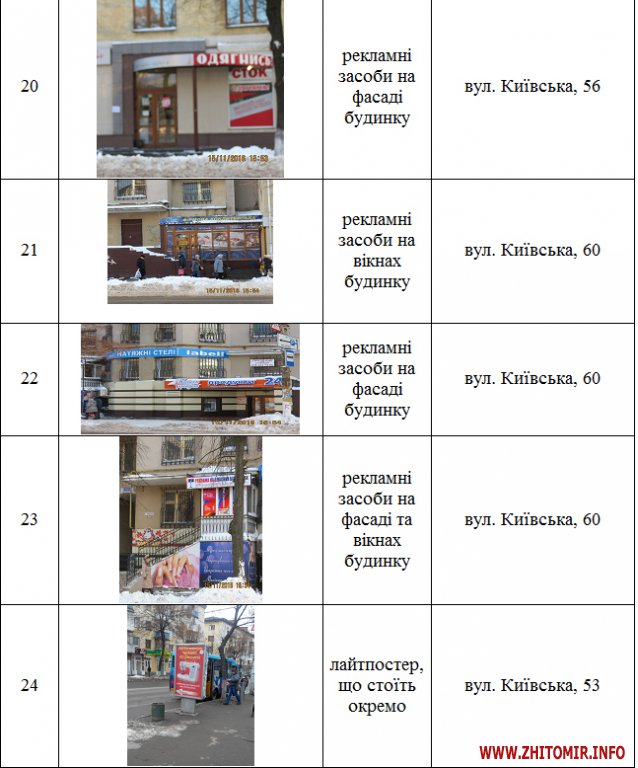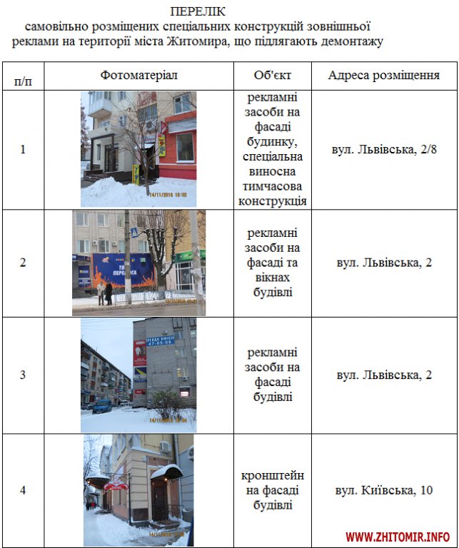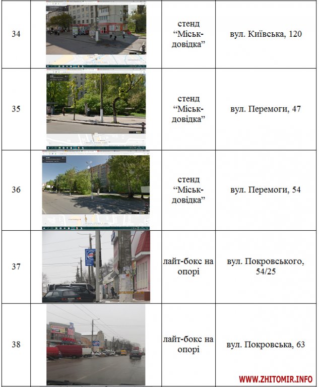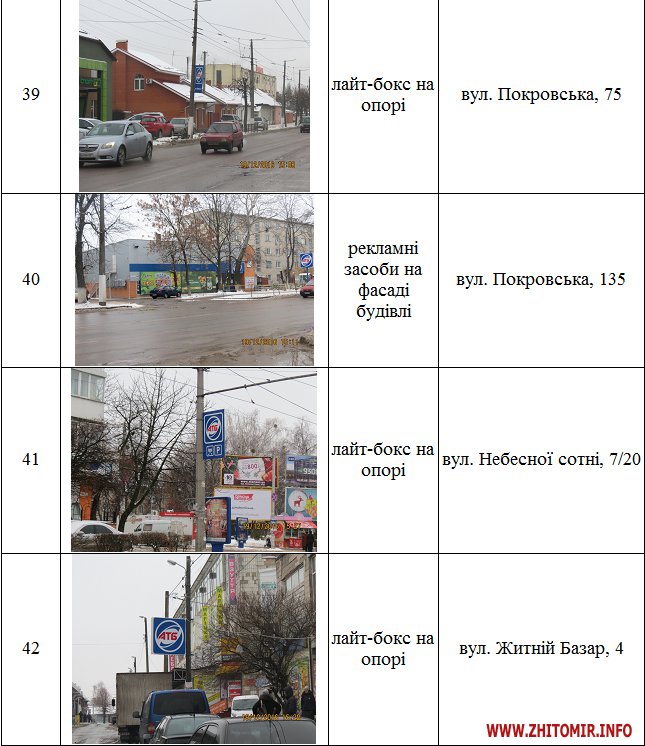 Крім того, на засіданні міськвиконкому 22 грудня 2016 року було прийняте рішення, яким затверджений перелік 44 самовільно розміщених спеціальних конструкцій зовнішньої реклами на території міста Житомира, що підлягають демонтажу.