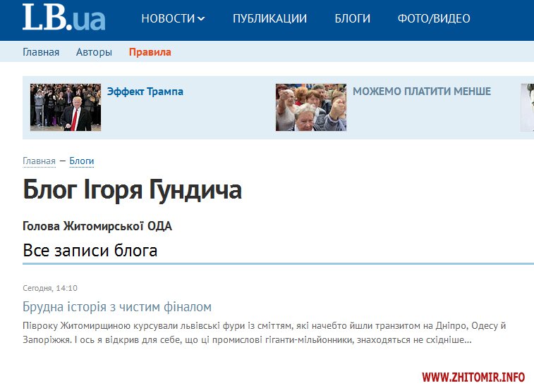 1 лютого на сайті «Лівій берег» з’явилася публікація за підписом голови Житомирської ОДА Ігоря Гундича під назвою «Брудна історія з чистим фіналом».