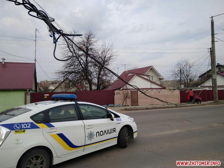 29 березня житомирським патрульним довелося «примірити» роль електриків на вулиці Вільський Шлях (колишня Максютова), де провислий над дорогою кабель заважав руху транспорту.