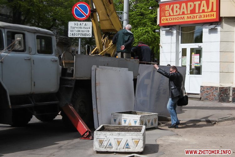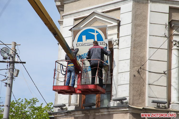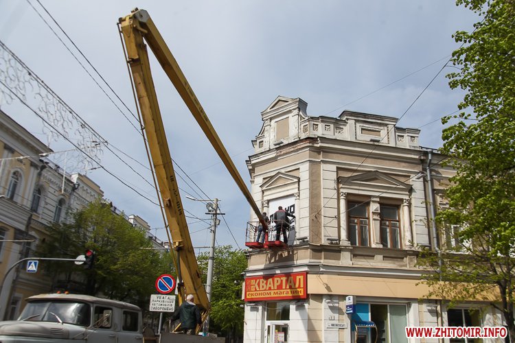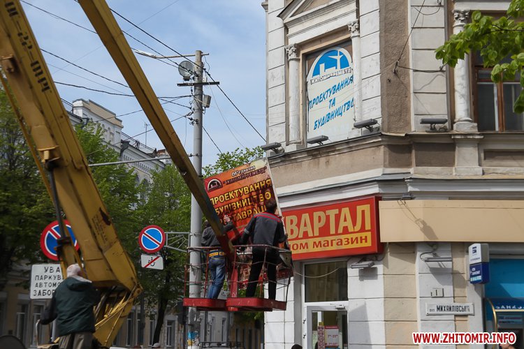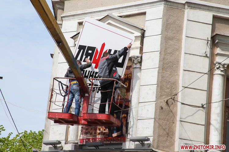 Уранці 28 квітня з фасаду будівлі по вулиці Великій Бердичівській, 15, де знаходиться магазин «Квартал», демонтували банер Радикальної партії Олега Ляшка і решту банерів, які були за ним.