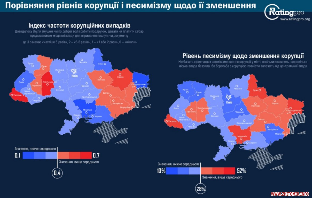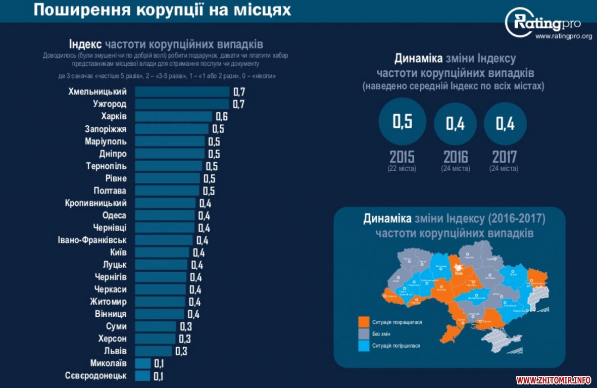 Цікаві результати, які стосуються корупції: Житомир входить до тих областей, де у порівнянні з опитуванням 2016 року ситуація з частотою корупційних випадків погіршилася, при цьому індекс частоти корупційних випадків, коли були змушені чи добровільно давали хабар (подарунок) представникам місцевої влади, становить 0,4, а рівень песимізму щодо зменшення корупції нижче середнього по Україні.