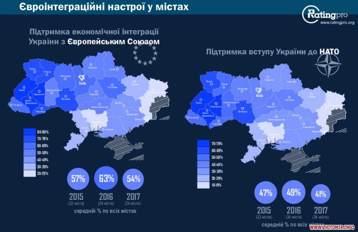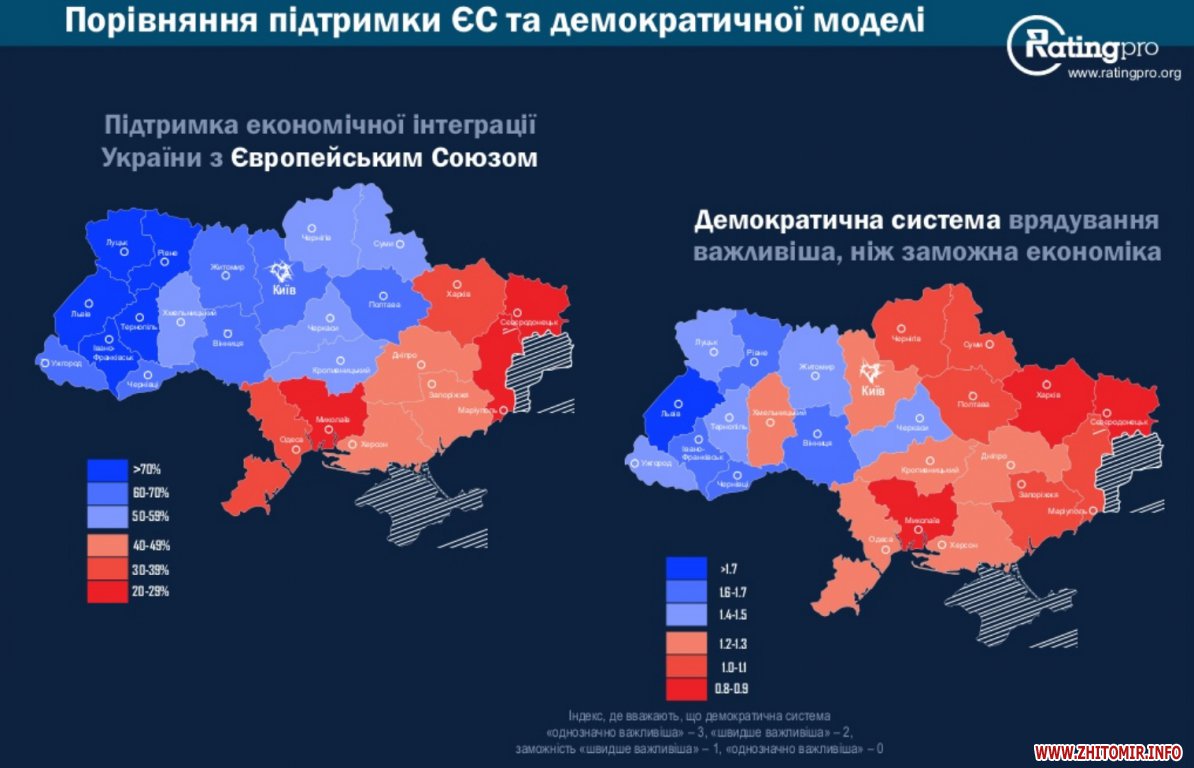 60-70% опитуваних житомирян підтримують економічну інтеграцію з Європейським Союзом, а щодо того, чи важливіша демократична система врядування, ніж заможна економіка, то наші земляки більш схильні до демократії: індекс 1,4-1,5 при тому, що оцінки 3 і 2 були за важливість демократичного врядування, а 1 і 0 – за важливість заможності.