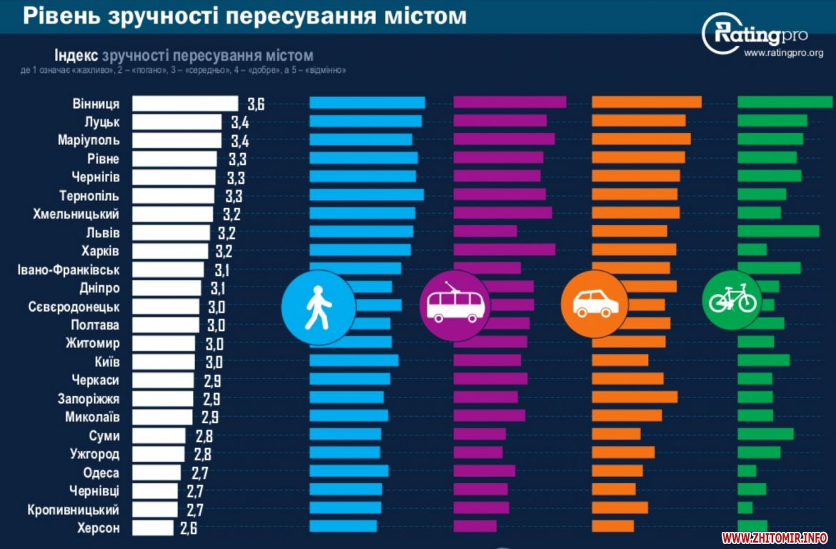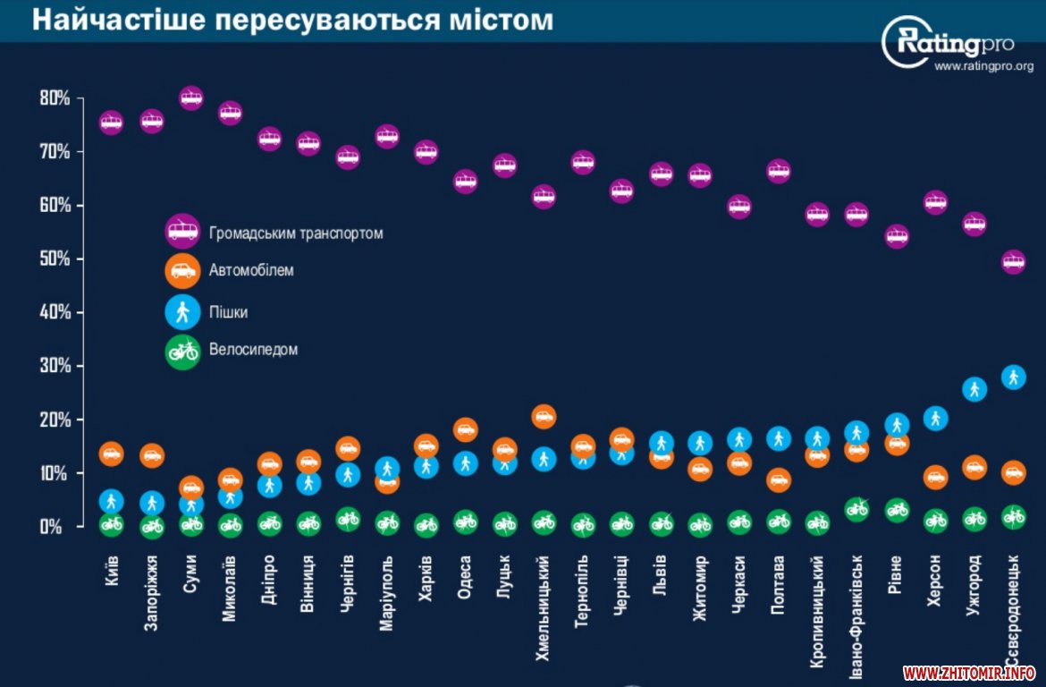 Що стосується варіантів пересування містом, то майже 70% житомиряни користуються громадським транспортом, а пішки ходить більше людей, ніж їздить автомобілями. При цьому рівень зручності пересування опитувані оцінили на трієчку – «середній».