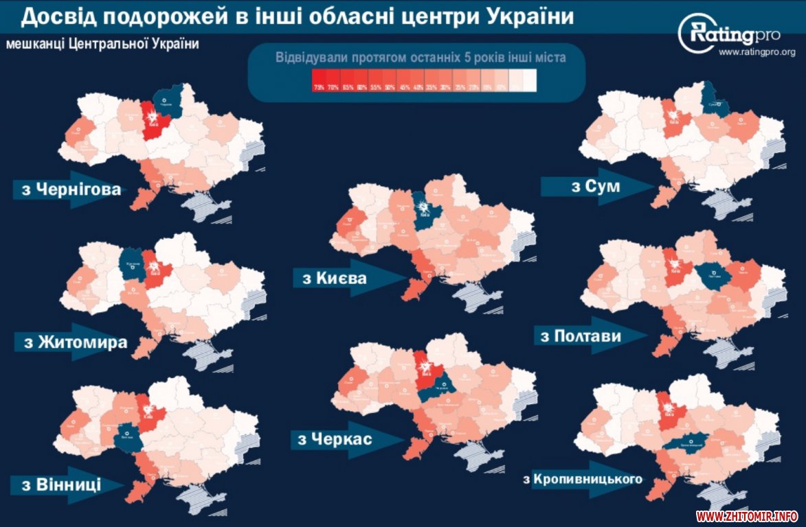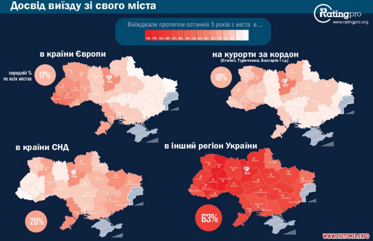 Третє всеукраїнське муніципальне опитування, яке соціологічна група «Рейтинг» проводила від імені Міжнародного республіканського інституту, показало, що менше 10% житомирян їздять в країни СНД та на курорти за кордон, трохи більше відвідують Європу та більше 50% їздили в інші регіони України. Найчастіше з Житомира їздять у Київ, Вінницьку, Одеську та Львівську області.