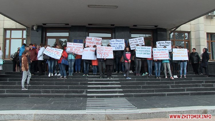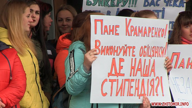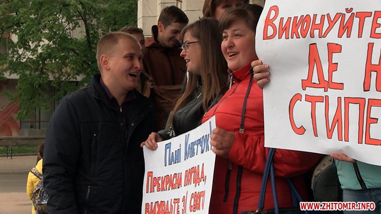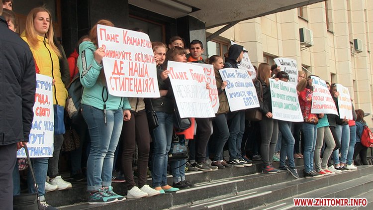 Близько ста студентів та працівників Бердичівського медколеджу приїхали пікетувати Житомирську облдержадміністрацію 12 травня. Люди вимагають від обласної влади вирішити питання із виплатою зарплат та стипендій, яку, за словами останніх, затримують вже другий місяць.