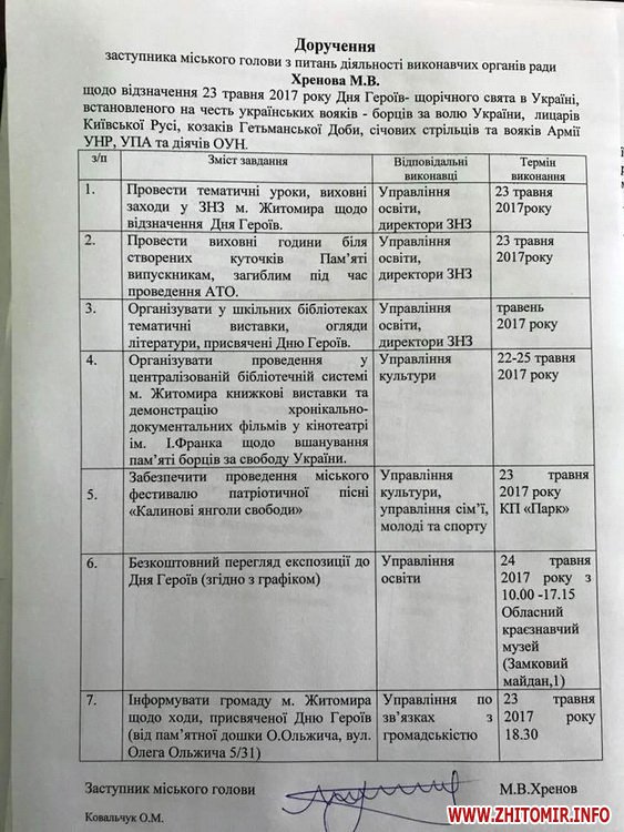 План проведення заходів 17 травня на своїй сторінці у Facebook виклав заступник Житомирського міського голови Матвій Хренов. У ньому йдеться про демонстрацію хронікально-документальних фільмів у кінотеатрі ім. Івана Франка (вул. Михайлівська) та проведення фестивалю патріотичної пісні «Калинові янголи свободи» на території комунального підприємства «Парк».