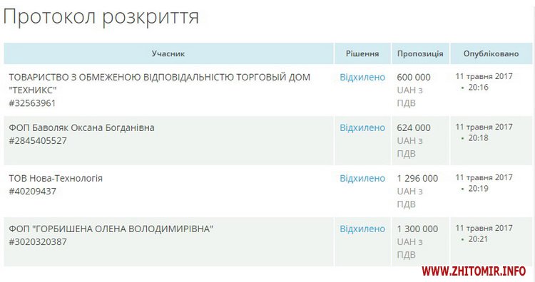 Найдорожчою пропозицією (1,3 мільйона) – була пропозиція фізичної особи-підприємця Горбишеної Олени Володимирівної з Житомира, найвигіднішою – 600 тисяч гривень - ТОВ «Торговий дім «Техникс» (м. Харків).