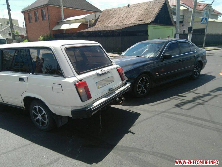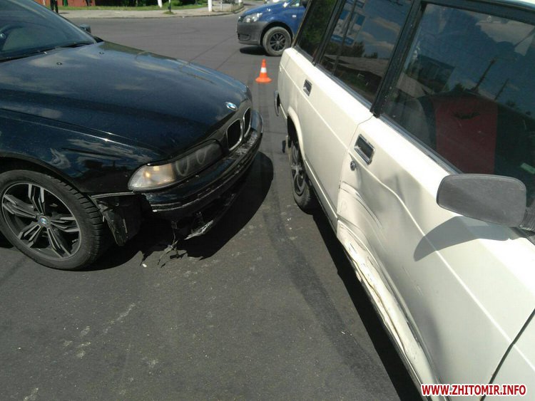 «29 травня близько 13 години на перехресті вулиці Покровська й проспекту Незалежності в Житомирі трапилася дорожньо-транспортна пригода за участю автомобілів ВАЗ 2104 та BMW. ВАЗ рухався по Покровській в напрямку центру міста на червоний сигнал світлофора, BMW - по проспекту Незалежності в напрямку автовокзалу. На перехресті відбулося зіткнення, потерпілих немає», - розповіли у патрульній поліції.
