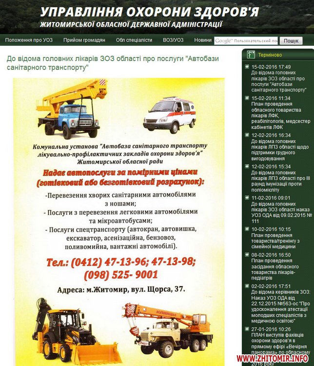 Як повідомляв Житомир.info, в лютому 2016 року на сайті управління охорони здоров’я Житомирської ОДА було розміщене оголошення про послуги перевезення хворих санітарними автомобілями з ношами, яку надає комунальна установа «Автобаза санітарного транспорту лікувально-профілактичних закладів охорони здоров’я».