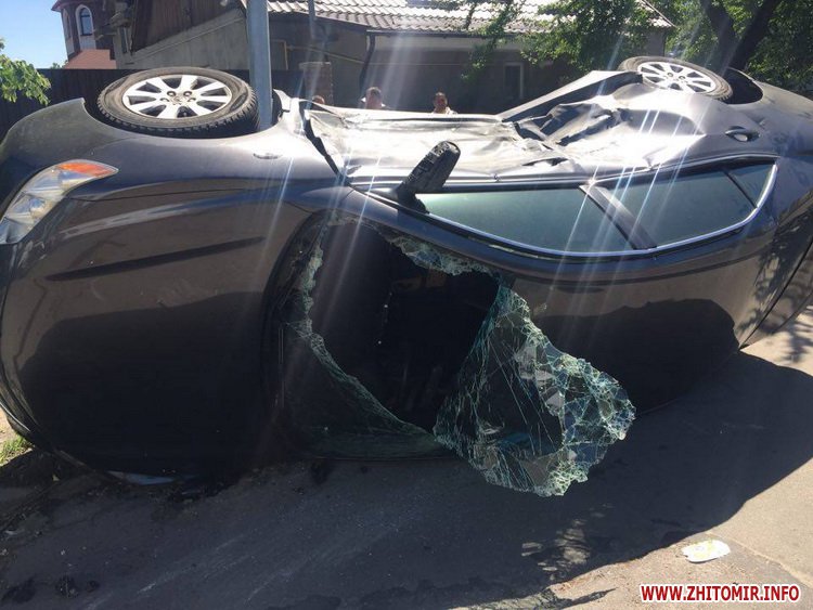 В аварії на перехресті, яка сталася близько 14.00, зіштовхнулися Geely та Toyota, остання від удару перекинулася на бік. За словами очевидців, Geely їхала по Івана Мазепи в бік вулиці Корольова, а Toyota рухалися по вулиці Героїв Крут в напрямку музею космонавтики.