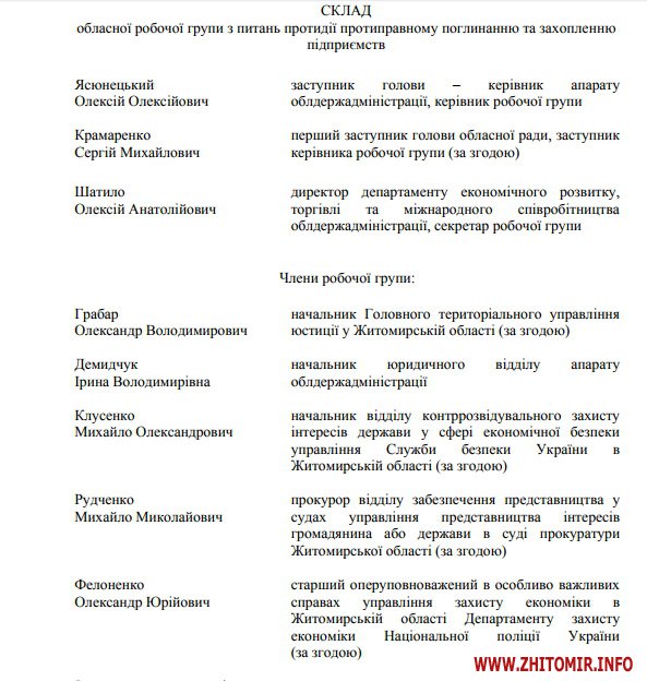 Згідно з новим розпорядженням, членами робочої групи з протидії захопленню підприємств є начальник начальник головного територіального управління юстиції у Житомирській області Олександр Грабар, начальник юридичного відділу апарату ОДА Ірина Демидчук, начальник відділу управління СБУ Михайло Клусенко, прокурор Михайло Рудченко та оперуповноважений управління захисту економіки в Житомирській області Департаменту захисту економіки Нацполіції Олександр Фелоненко.