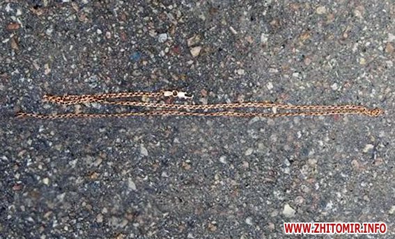 Так, 14 липня пре-служба ГУНП повідомила про те, що у під’їзді будинку парубок пограбував житомирянку, зірвавши з неї прикрасу із золота. Поліцейські кримінальної поліції та патрульні, які прибули на виклик, за кілька кварталів від місця події затримали схожого за описом молодика.