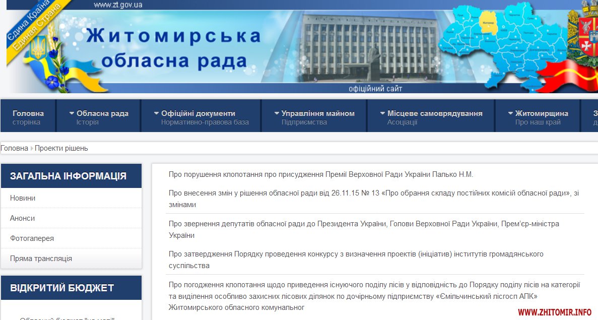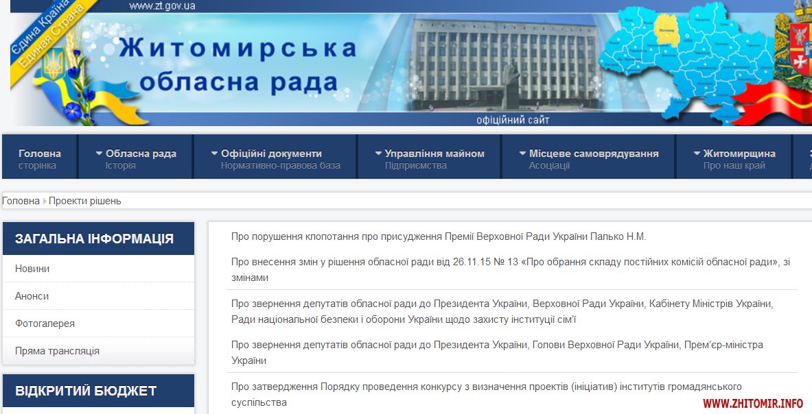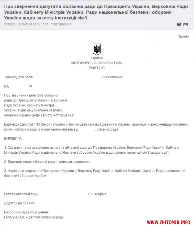 З сайту Житомирської обласної ради видалили проект рішення сесії про схвалення тексту звернення депутатів обласної ради до Президента України, Верховної Ради України, Кабінету Міністрів України, Ради національної безпеки і оборони України щодо захисту інституції сім’ї, який був опублікований 19 липня.